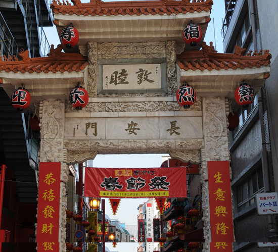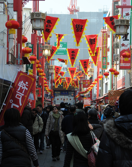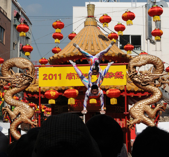 有着120多年历史的神户南京街在中国兔年春节来临之际到处洋溢着节日的喜庆气氛。南京街3个入口处张贴着“生意兴隆 恭喜发财”的春联,沿街古色古香的建筑物上高挂着红灯笼和写有“春节祭”的彩条。街上游人如潮,一个不大的街心广场上临时搭建的舞台周围更是围满了观众。