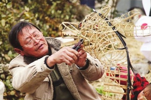 费土根说,草龙的制作光凭他一个人的力量是不够的,他有几个好帮手。“他们个个都是正宗的篾匠,削竹子的手艺都比我强。”但费土根之所以为“传承人”,自然有他的“绝活”——设计。这是其他人所无法替代的,无论是扎草龙,或是兔子灯这些民俗灯彩,费土根都不用画设计图,静静地想一想,构思便全在脑海中,一点点地扎编便是。因此,在团队里,他是设计师、指挥者,也是核心。