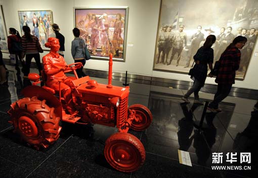 9月26日,观众在《时代多彩》美展现场观赏雕塑和绘画作品。当日,第五届亚洲美术馆馆长论坛在南京开幕,论坛专题展中的《时代多彩——第十一届全国美展江苏获奖及入选作品汇展》、《南北二石——傅抱石齐白石中国画作品展》、《走进大师——中国美术馆藏路德维希捐赠作品展》三大美术展览同时在江苏省美术馆举行,来自中外美术家的400多件作品给观众带来美的享受。第五届亚洲美术馆馆长论坛共有来自中国、日本、韩国、新加坡、印度等10多个亚洲国家和地区的46家美术馆以及美国、德国、澳大利亚等国观察员美术馆的馆长、专家参加。