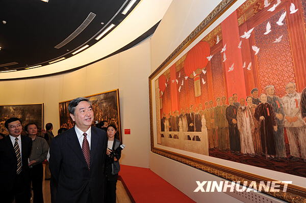 9月22日,新华社社长、国家重大历史题材美术创作工程艺术委员会主任李从军在观看国画《新中国诞生》。当日,由中宣部、文化部、财政部主办的国家重大历史题材美术创作工程作品展在北京中国美术馆开幕,共展出作品102件。国家重大历史题材美术创作工程以我国波澜壮阔的反帝、反封建、反殖民主义斗争和社会主义革命、建设、改革的重大历史事件为主题内容,选拔组织我国目前具有创作实力的优秀艺术家,集中创作完成一批表现自1840年至今我国重大历史事件的大型的主题性美术作品。新华社记者 金良快摄