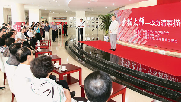 作为展览作品的创作者,李岚清知道所有来观展的人都对他的作品充满好奇。他在开幕式现场向来宾们亲切随和地讲述起自己的创作缘由:“我退休8年半。退休之初我就立志:健身健脑,读书写作。这是我自己的人生目标和追求。前段时间我专注于音乐和篆刻。一开始,潘公凯就提醒我,根据他父亲潘天寿治印的体会,做篆刻会上瘾的——结果,不幸被他言中:退休之后我沉迷于篆刻,废寝忘食共刻了700余方印。去年,我的脊椎再也无法承受这样高强度的压力,但我也不能闲着,所以需要找一个事情,戒掉篆刻的瘾。这一个事情,就是素描。”李岚清幽默的讲述,使现场气氛和谐轻松。而文艺界几乎都知道,李岚清同志近些年为推动音乐普及和创作研究,为弘扬祖国优秀传统文艺,为宣传伟大的中华文明,确是呕心沥血,功莫大焉。中国文联党组书记、副主席赵实在开幕式致辞中给予了精辟的评价。她说:“素描是造型艺术的基础,是画家必备的一项基本功,注重线条运用的科学和物象造型的准确,为欧洲文艺复兴时期的巨匠达芬奇、米开朗基罗以及我国现代大师徐悲鸿、王式廓等前辈所推重。岚清同志是党中央第三代领导集体的重要成员,为推动我国改革开放和社会主义现代化建设事业作出了巨大贡献,特别是为领导我国文化事业的繁荣发展,付出了巨大的辛劳,取得了巨大成就,深受全国人民和文艺界的衷心爱戴。岚清同志心系党的文艺事业,志趣高雅,融贯中西,多才多艺,在繁忙的政务之余,雅好丹青、翰墨,精通音律、篆刻,是广大文艺家的良师和益友,为领导干部修德、从政,也为文艺家从艺、做人树立了典范。今天我们展出的岚清同志的120多幅素描作品,以中国传统的诗、书、画、印一体的形式,艺术地再现了我国声望夙著的近现代文艺大师们的神韵,堪称独具匠心的艺术创意,不仅为中国文艺家之家增添了一道亮丽的风景,同时对于扩大宣传我国文艺史上贡献卓著的文艺大师们的艺术成就与影响,对于先进文化的传承和艺术普及教育,都具有十分重要而深远的意义。”