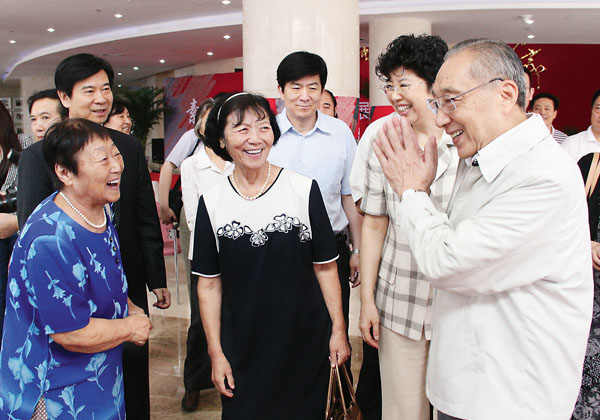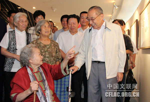 李岚清素描作品展受到文艺大师亲属的高度认可,图为李岚清在展览现场跟大家亲切交流。