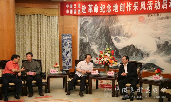文联副主席冯远在致辞中表示,为认真贯彻落实中央领导同志重要指示精神,推动创作、抓作品、抓人才、求发展,来促进美术事业的发展。根据中宣部和中国文联的安排,中国美协精心组织了这次系列活动。这个系列活动是近年来,中国美协组织的规模较大的一次创作和采风活动,活动宗旨是让多年来活跃在各个领域的美术家们,近距离体验生活,尤其是到革命纪念地来观察了解,学习和感受。目的是进一步深入挖掘红色资源的思想内涵,亲身感受在改革开放后红色老区发生的巨大变化,以及取得的各方面成就。同时,通过艺术家各自的创作推出一批融思想性、艺术性、观赏性俱佳的美术作品。