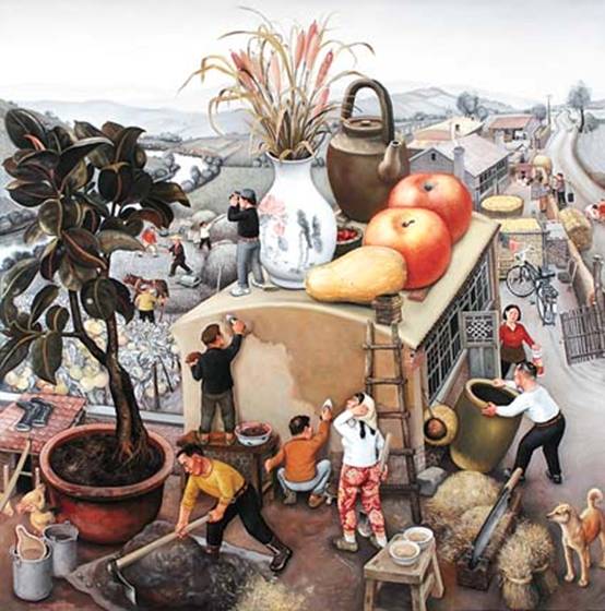 与之形成对比的是,“有一棵一次性筷子形成的筷子树,远远看去金碧辉煌、枝繁叶茂,近处细看,不免让人心生愧疚,是我们的日常的消费让曾经茁壮成长的大树变成了一根根方便筷。”中国艺术家罗志楠用金色的筷子冲击着我们的视觉,震撼着我们的心灵。这两张有代表性的作品,呈现出本届双年展“生态与家园”主题创作的两大趋势:一类是肯定性的、赞美性的,侧重于对保护生态环境的自觉意识和措施的积极肯定,对建设生态平衡的理想家园的热情赞美;另一类是批判性的、警示性的,侧重于对破坏生态环境的恶劣思想和行为的尖锐批判,对生态危机严重性的深刻警示;在形式上,这些作品仍然以绘画、雕塑形式为主,同时也吸纳了一些装置、影像等新媒体形式,其目的是为了更加多角度、全方位地表现“生态与家园”这一内涵极其丰富的主题。