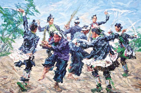 法国艺术家布里艾尔的铜、木结构作品《眩晕》,简明而生动地刻画了城市居民对绿色自然的渴望。柬埔寨画家钦·索蒂的布面油画以围困村庄的熊熊烈火冲击观者的视觉,作品《不要烧毁森林》,以最直白的方式表达人类对生态保护的诉求。毕建勋的中国画《子非鱼》以写实的画面叙述了中国古代哲人庄子与惠子的对话,暗喻爱护生物、保护环境的人类恒久理念。