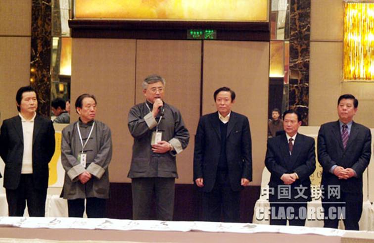 4月16日下午5点,中国书协百名书家“赈灾救助共献爱心”百米长卷捐赠仪式在京举行,中国书协向中华慈善总会捐赠了百名书法家现场创作的百米长卷用于赈灾救助,并决定向青海省文联捐善款50万元人民币,向灾区人民表达书法界的一片深情厚谊。中国文联党组书记、副主席胡振民,中国文联党组副书记、副主席覃志刚,中华慈善总会副会长邓铜山,中国文联副主席、中国书协副主席段成桂,中国书协分党组书记、驻会副主席赵长青,中国民协分党组书记、驻会副主席罗杨,中国书协副主席聂成文、申万胜、言恭达、吴东民、吴善璋、邵秉仁,中国书协副秘书长白煦,中国美协副秘书长张旭光,中华慈善总会新闻办公室主任张银俊等以及参加活动的百余名书法家出席了捐赠仪式。图为中国文联党组书记、副主席胡振民在捐赠仪式上讲话,倡议各门类艺术家尽快行动起来,关心支持灾区人民战胜困难、重建家园。中国文联网 冉茂金 摄