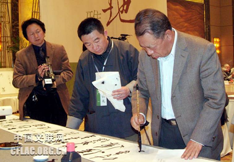 4月16日下午5点,中国书协百名书家“赈灾救助共献爱心”百米长卷捐赠仪式在京举行,中国书协向中华慈善总会捐赠了百名书法家现场创作的百米长卷用于赈灾救助,并决定向青海省文联捐善款50万元人民币,向灾区人民表达书法界的一片深情厚谊。中国文联党组书记、副主席胡振民,中国文联党组副书记、副主席覃志刚,中华慈善总会副会长邓铜山,中国文联副主席、中国书协副主席段成桂,中国书协分党组书记、驻会副主席赵长青,中国民协分党组书记、驻会副主席罗杨,中国书协副主席聂成文、申万胜、言恭达、吴东民、吴善璋、邵秉仁,中国书协副秘书长白煦,中国美协副秘书长张旭光,中华慈善总会新闻办公室主任张银俊等以及参加活动的百余名书法家出席了捐赠仪式。图为中国文联党组副书记、副主席覃志刚参加百米长卷创作。中国文联网 冉茂金 摄
