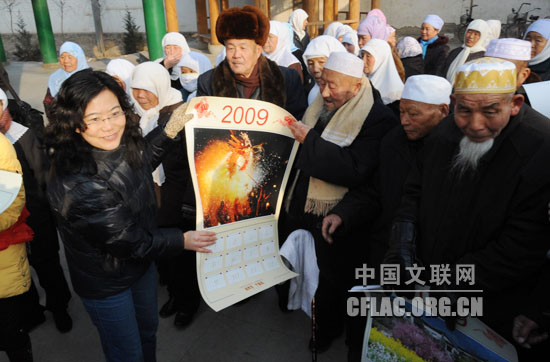 中国摄协分党组成员高琴把年历送给回族老人。王妍峰 摄