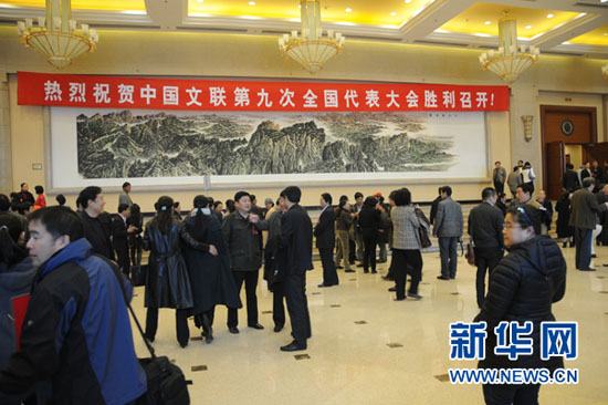 11月21日,中国文联第九次全国代表大会预备会议在京举行,会议通过了第九次文代会领导机构和大会议程。这是代表们在会场外热烈交流。新华网 张晋龙 摄