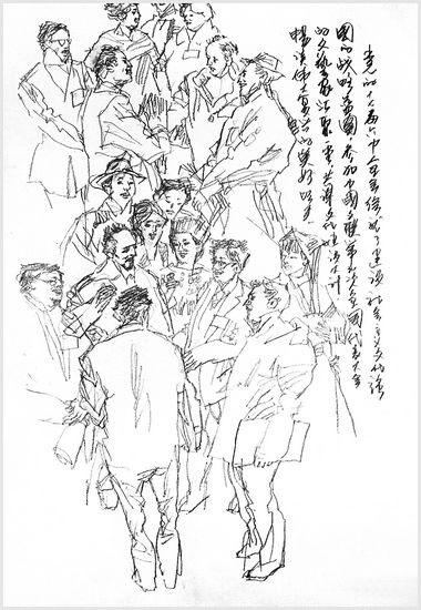党的十七届六中全会绘就了建设社会主义文化强国的战略蓝图,参加中国文联第九次全国代表大会的文艺家汇聚一堂,共谋文化建设大计,畅谈伟大复兴的美好明天(速写)