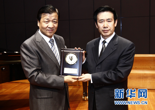 9月19日晚,第八届茅盾文学奖颁奖典礼在北京国家大剧院举行。中共中央政治局委员、中央书记处书记、中宣部部长刘云山出席颁奖典礼。这是刘云山为获奖作家张炜颁奖。新华社记者庞兴雷摄