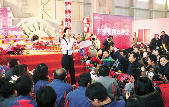 中国文联、中国音协赴银川慰问演出,歌手的演唱赢得工人们的喝彩。图为曹芙嘉演唱。