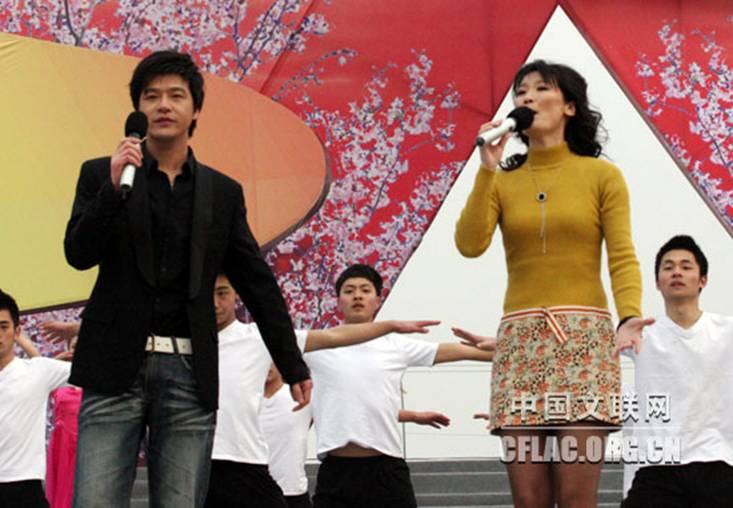 中国文联组织文艺家奔赴四川地震灾区绵竹市和北川县,举行“送欢乐、下基层”慰问演出活动。图为杨竹青、江凯文演唱歌曲《走到一起来》。