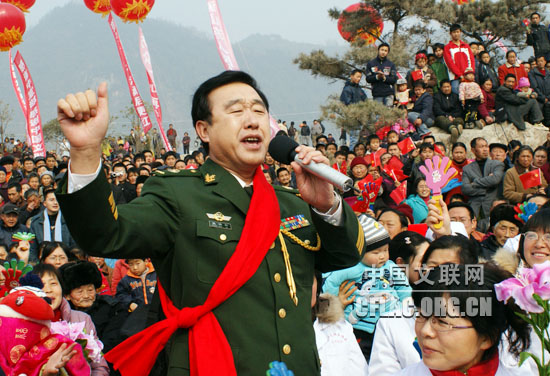 1月14日至15日,中国文联组织文艺家奔赴四川地震灾区绵竹市和北川县,举行“送欢乐、下基层”慰问演出活动。图为张保和演唱《中国雄起》。邓风 摄