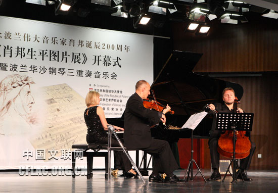 10月12日,由波兰共和国驻华大使馆、中国文联和中国音协联合主办的《纪念波兰伟大音乐家肖邦诞辰200周年——肖邦生平图片展》在中国文艺家之家开幕。图为波兰华沙钢琴三重奏小型音乐会。张大勇 摄