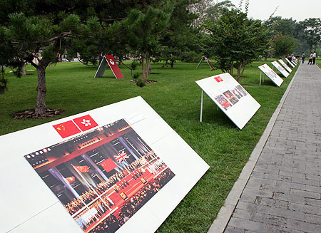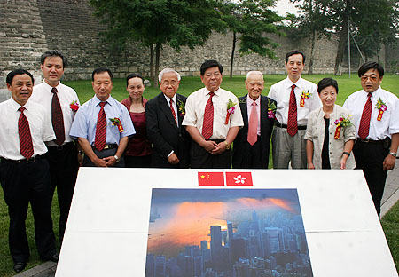 胡振民、廖奔等在简庆福拍摄的《日出东方、朝霞万丈, 香港的明天一定会更加美好》前合影。本网记者 郭青剑 摄