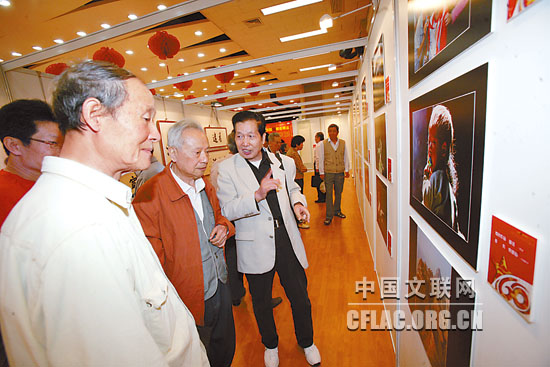 9月28日,由中国文联离退休干部局举办的庆祝新中国成立60周年中国文联老同志书画摄影作品展览在中国文联机关二层多功能厅开幕。图为老同志们兴致勃勃地观展。中国文联网 孟祥宁 摄