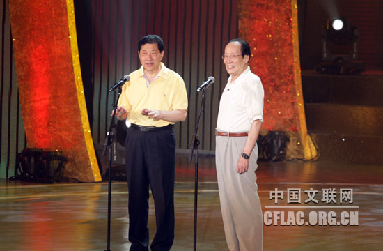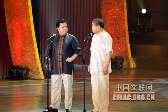 6月17日晚,中国文学艺术界纪念建党90周年主题系列演出之和谐阳光——相声小品综艺晚会在北京民族文化宫大剧院举行。图为常宝华、常贵田表演相声《说海》。中国文联网 董大汗 摄