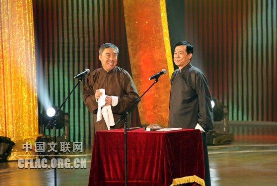 6月17日晚,中国文学艺术界纪念建党90周年主题系列演出之和谐阳光——相声小品综艺晚会在北京民族文化宫大剧院举行。图为师胜杰、石富宽表演相声《老戏台》。中国文联网 董大汗 摄