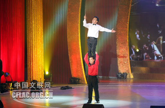 6月17日晚,中国文学艺术界纪念建党90周年主题系列演出之和谐阳光——相声小品综艺晚会在北京民族文化宫大剧院举行。图为刘全和、刘全利的滑稽表演《指挥家与钢琴家》。中国文联网 董大汗 摄