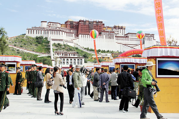8月的雪域高原,鲜花盛开,风景如画,恰逢一年一度的拉萨雪顿节盛大开幕,全区人民一片欢腾。在隆重庆祝中国共产党成立90周年和西藏和平解放60周年之际,中国文联于8月26日至9月4日组成慰问采风团赶赴西藏,与西藏有关部门联合举办“纪念西藏和平解放60周年全国书法名家作品展”和“2011·中国西藏珠穆朗玛摄影大展”,以书法精品和摄影佳作为西藏和平解放60周年献上一份厚礼;与西藏文艺界座谈,看望老艺术家,详细了解西藏文艺事业和文联工作情况;深入拉萨、山南和日喀则的基层农牧区和边防哨所等进行慰问演出和采访采风活动,为西藏各族人民群众送去精美文化食粮,表达全国文艺界的深情厚意,并向西藏人民学习和致敬。