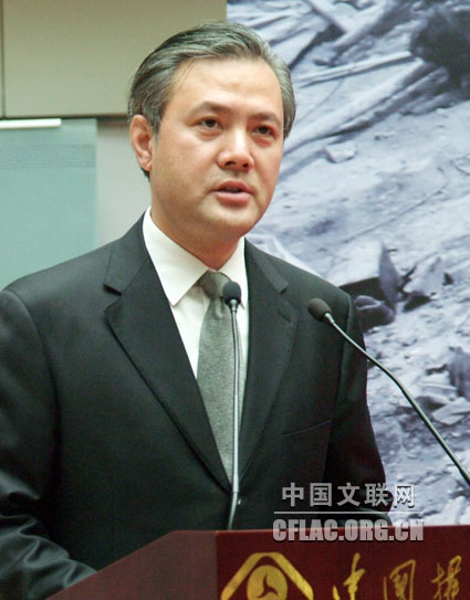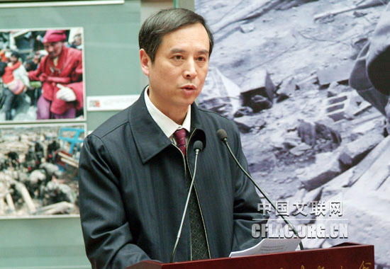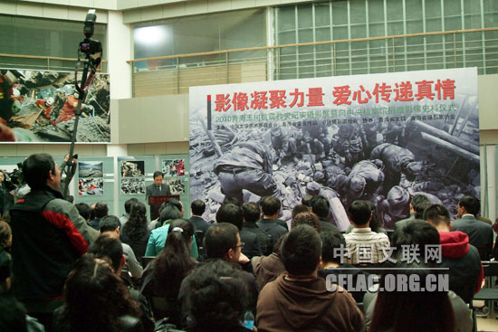 由中国文联、青海省委宣传部、中国摄协主办,青海省文联、青海省摄协协办的“影像凝聚力量 爱心传递真情——2010青海玉树抗震救灾纪实摄影展”4月20日在京开幕。图为中国摄协分党组书记、副主席兼秘书长李前光致辞。中国文联网 郭青剑 摄
