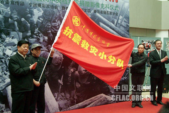 由中国文联、青海省委宣传部、中国摄协主办,青海省文联、青海省摄协协办的“影像凝聚力量 爱心传递真情——2010青海玉树抗震救灾纪实摄影展”4月20日在京开幕。图为中国文联党组书记、副主席胡振民(左一)为中国摄协抗震救灾小分队授旗。中国文联网 郭青剑 摄