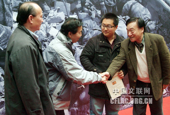 由中国文联、青海省委宣传部、中国摄协主办,青海省文联、青海省摄协协办的“影像凝聚力量 爱心传递真情——2010青海玉树抗震救灾纪实摄影展”4月20日在京开幕。图为中国摄协副主席朱宪民(右一)、邓维(左一)向青海省摄协主席蔡征(左二)、新华社记者邢广利等参展摄影家代表颁发参展证书。中国文联网 郭青剑 摄