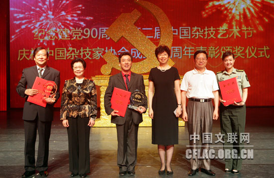 6月18日晚,“纪念建党90周年·第二届中国杂技艺术节”精品杂技节目展演暨表彰颁奖仪式在北京天桥剧场举行。图为中国文联党组书记赵实,中国文联荣誉委员、海军政治部主任王兆海,中国文联副主席、中国杂协名誉主席夏菊花为获得终身成就奖的艺术家颁奖。中国文联网 孟祥宁 摄