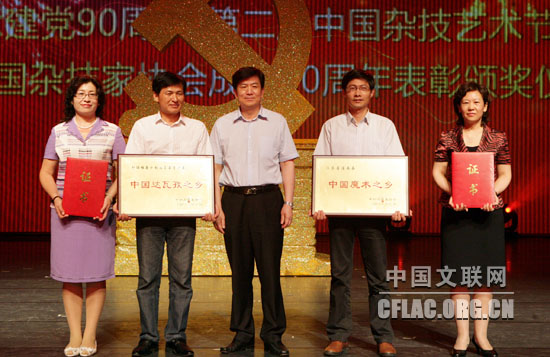 6月18日晚,“纪念建党90周年·第二届中国杂技艺术节”精品杂技节目展演暨表彰颁奖仪式在北京天桥剧场举行。图为中国文联党组副书记、副主席李屹向魔术之乡和达瓦孜之乡颁发匾额和证书。中国文联网 孟祥宁 摄