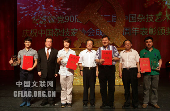 6月18日晚,“纪念建党90周年·第二届中国杂技艺术节”精品杂技节目展演暨表彰颁奖仪式在北京天桥剧场举行。图为中国文联党组成员、副主席冯远,中国文联党组成员、书记处书记夏潮,中国杂协主席边发吉为个人单项奖获得者颁奖。中国文联网 孟祥宁 摄