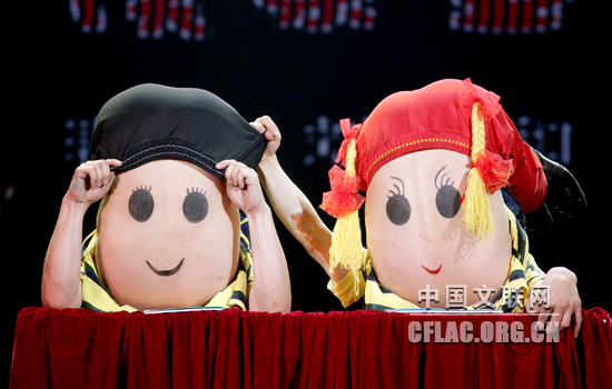 6月18日晚,“纪念建党90周年·第二届中国杂技艺术节”精品杂技节目展演暨表彰颁奖仪式在北京天桥剧场举行。图为滑稽《同桌的你》。中国文联网 孟祥宁 摄