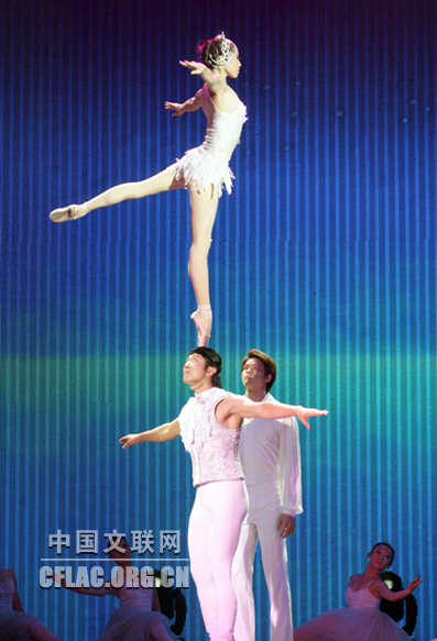 6月18日晚,“纪念建党90周年·第二届中国杂技艺术节”精品杂技节目展演暨表彰颁奖仪式在北京天桥剧场举行。图为杂技《东方的天鹅——芭蕾对手顶》。中国文联网 孟祥宁 摄