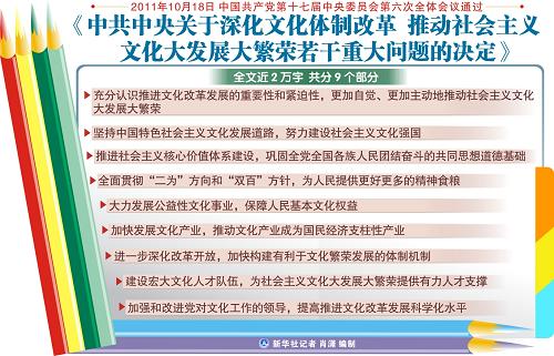 2011年4月,中央政治局常委会会议、中央政治局会议讨论决定:党的十七届六中全会重点研究深化文化体制改革、推动社会主义文化大发展大繁荣问题。