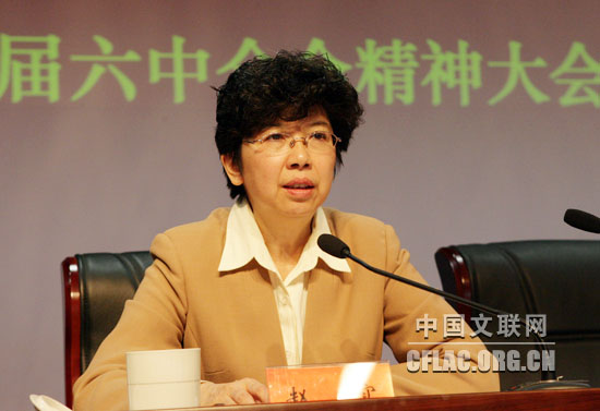10月19日,中国文联召开大会,传达贯彻党的十七届六中全会精神。图为中国文联党组副书记、副主席李屹传达中央领导同志在十七届六中全会上的重要讲话精神。中国文联网 孟祥宁 摄