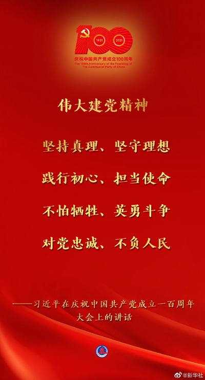 习近平说,一百年前,中国共产党的先驱们创建了中国共产党,形成了坚持真理、坚守理想,践行初心、担当使命,不怕牺牲、英勇斗争,对党忠诚、不负人民的伟大建党精神,这是中国共产党的精神之源。