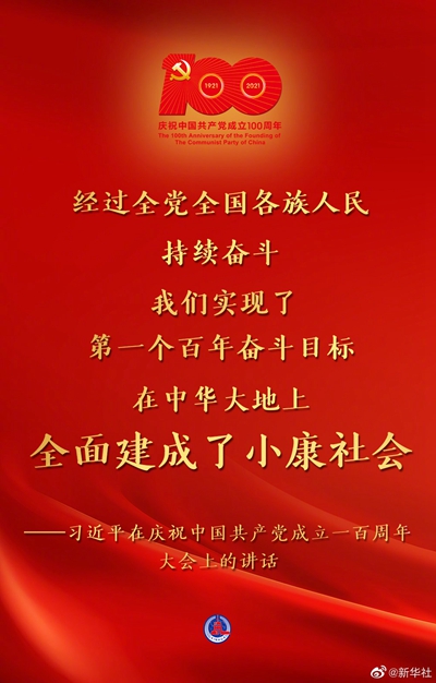 习近平代表党和人民庄严宣告,经过全党全国各族人民持续奋斗,我们实现了第一个百年奋斗目标
