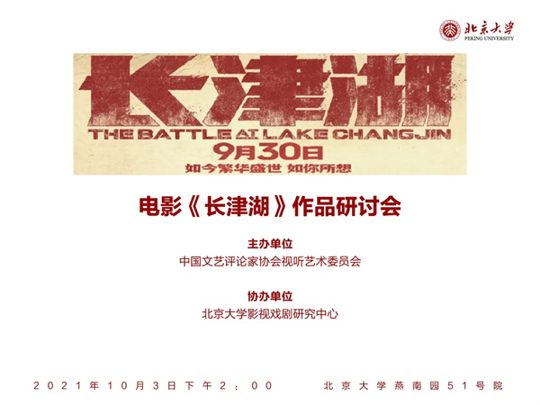 10月3日下午,由中国文艺评论家协会支持,中国评协视听艺术委员会主办,北京大学影视戏剧研究中心协办的电影《长津湖》作品研讨会在北京大学燕南园51号院举行。中国评协视听艺术委员会委员、北京大学艺术学院教授、北京大学影视戏剧研究中心主任陈旭光与中国评协理事兼视听艺术委员会秘书长、中国传媒大学戏剧影视学院教授戴清主持会议,张德祥、陈先义、李道新、刘星、邓凯、向阳、王丹、田水泉、顾亚奇等评论家、学者与编剧共同参加研讨会。《光明日报》、中央广播电视总台《中国文艺报道》、《中国艺术报》、中国文艺评论网等多家媒体宣传报道。