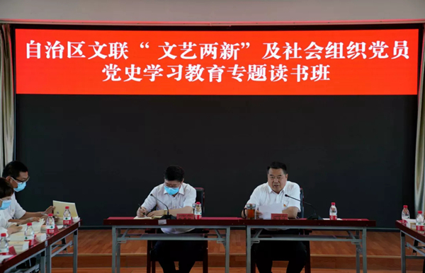 自治区文联召开”文艺两新”及社会组织党员党史学习教育专题读书班,图为自治区文联党组书记、副主席邓选斌讲专题党课。