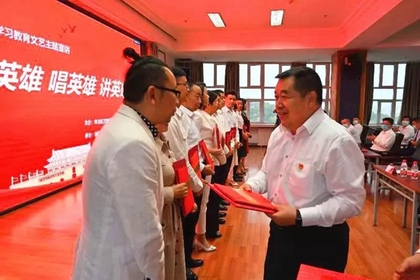 自治区文联举办党史学习教育主题宣讲活动,图为自治区文联党组书记、副主席邓选斌为宣讲团成员颁发聘书。
