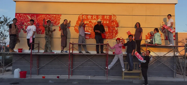 昌吉州文联组织美术家协会在昌吉州文联访惠聚工作队所驻昌吉市庙尔沟乡和谐二村绘制文化墙。图为活动现场。
