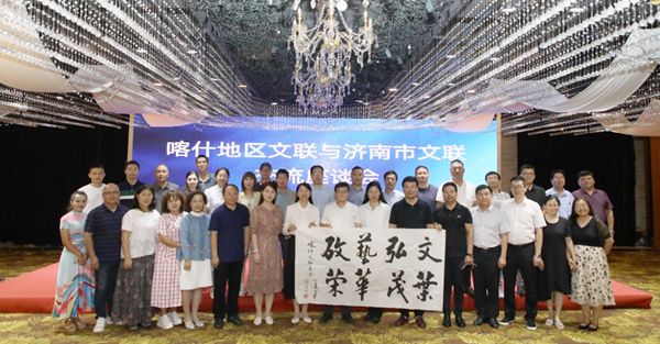 8月11日,两地文联座谈会上,济南文艺志愿者协会主席王克,济南市音协主席陈雷,济南市市中区文联主席马兴园、槐荫区文联主席吴忠胜与喀什地区文联文艺骨干进行交流座谈。两地文艺工作者围绕加强基层文联组织管理、发挥文艺家协会作用、开展文艺志愿服务活动、强化文艺阵地建设及文艺两新组织发展等方面的工作进行了深入探讨和交流,并就进一步加强协作交流达成一致意见。