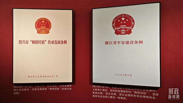 △枫桥经验陈列馆展示的当地相关条例。(总台央视记者郁振一拍摄)