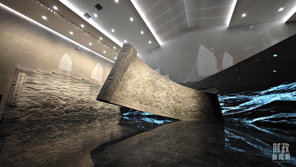 △博物馆内的《浙东运河水利形胜图》《浙东山水大势图》浮雕。(总台央视记者彭汉明拍摄)