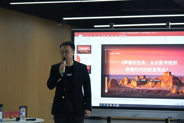 下半场,演员、长影译制片厂资深配音艺术家孟令军带来《声音的生命:从长影传统到数智时代的配音表达》主题分享。作为配译一千五百多部影片的行业大咖,孟令军结合《青年马克思》《神探夏洛克》《神偷奶爸》等代表作的配音经历,深入浅出地讲解了配音的发声技巧、情感传递、角色塑造等专业知识,展现了从长影传统配音艺术到数智时代配音技术的传承与创新。为让学员直观感受配音魅力,现场特别设置情景演绎与配音互动环节,孟令军以影片《头脑特工队》为例,亲自指导学员进行经典片段配音实践,耐心纠正发音与情感表达问题,学员们积极参与、踊跃尝试,在沉浸式体验中夯实了专业基础,现场氛围热烈活跃。