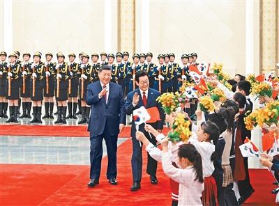 习近平指出,当前世界百年变局加速演进,国际形势更加变乱交织。中韩在维护地区和平、促进全球发展方面肩负重要责任,有广泛利益交集,应当坚定站在历史正确一边,作出正确战略选择。80多年前,中韩两国付出巨大民族牺牲,赢得抗击日本军国主义的胜利。今天更应携手捍卫二战胜利成果,守护东北亚和平稳定。作为经济全球化的受益者,中韩要共同反对保护主义,践行真正的多边主义,为推进平等有序的世界多极化、普惠包容的经济全球化作出贡献。
