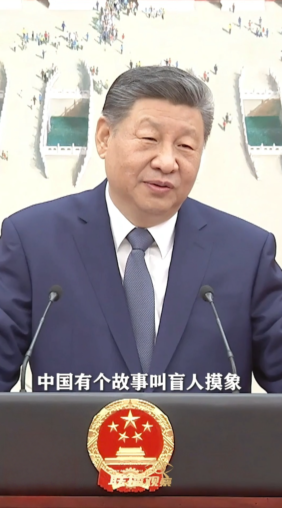 仪式结束后,习主席在对使节们发表讲话时,讲到一则“盲人摸象”的寓言故事。习主席说:“象很大,如果是一个盲人,他摸到一条腿,就说象是一个柱子,摸到肚子,就说象是一堵墙,但实际上不是完整的象。”