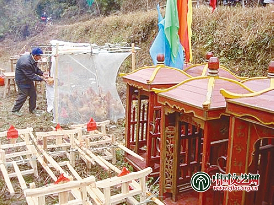 蚊帐鸡棚内活生生三百雄鸡,瞬间被扭捏成无头冥鬼。一场鸡殇,恐怖,太恐怖!也是我没有想到,也想不出来的。一位法师告诉我,闾山夫人教对神灵有斋神与荤神之分。斋神茹素,不领兵马,诞日信众须持斋;荤神吃肉,带兵练将,诞日信众亦可沾荤腥。荤神(如关圣帝君、赖公元帅等)神诞法事“收营”后,还有一项“藏兵”科仪,目的在于将荤神所领兵马收到其所在庙宇里的营寨常驻,该营寨教内称“兵桶”。兵桶里放置碗、筷、汤匙各24副,香烟、火柴、笔墨、草鞋、茶叶、纸扇各4件,米包、五谷包、五金包各2件,雄鸡头一般1个,以供兵马日常之需。斋神,不带兵,其庙不设兵桶。这次打醮一次掐死三百余生灵,不知是否有人想吃百鸡宴了?