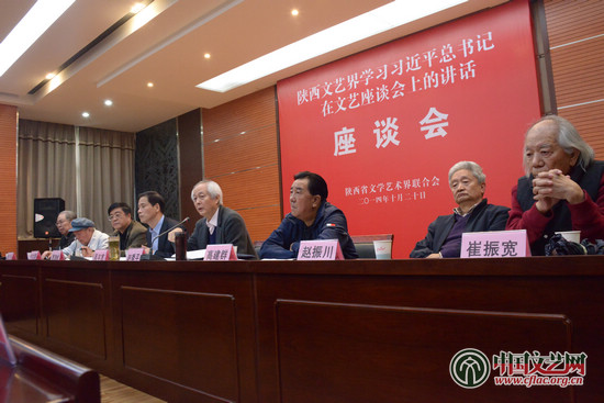 中国音乐家协会主席、陕西省文联主席赵季平,陕西省作协副主席高建群,中国美协顾问、陕西省美协名誉主席刘文西,陕西省文联副主席刘远,陕西省书协名誉主席吴三大,陕西省美协名誉主席赵振川,陕西省美协副主席、西安美术学院院长郭线庐,陕西广播电视台著名导演万盛华,陕西省文艺评论家协会主席李震,西安秦腔剧院易俗社社长慧敏莉,著名文艺评论家李星,陕西省曲艺家协会副主席王茵等文艺家代表先后发言,畅谈了学习习近平总书记讲话的体会。