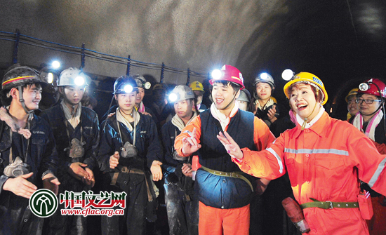 在“我们的沃土我们的梦”千名文艺家下基层采风创作活动中,艺术家在六百米井下为矿工演出